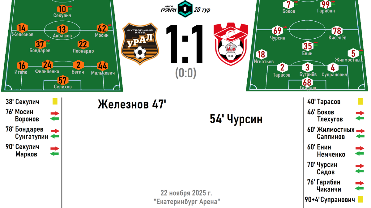 На самом деле, несмотря на территориальное преимущество «Урала» на протяжении бóльшей части встречи, свой набранный балл спартаковцы полностью заслужили. На поражение не наиграли совершенно точно. Ибо откровенно на отбой – не играли. Да и гол в наши ворота – тот, что в буквальном смысле прилетел «из раздевалки» – вышел каким-то… нелогичным. Ни по конкретному эпизоду, ни по предшествовавшему течению игры. Иную команду такой «залётный навес» мог бы сломать – но не нашу. Очередной стандарт, очередной отскок мяча «туда, куда надо» – и вот уже счёт равный. Снова, как и на «Урожае», «Спартак» отыгрывается. И снова ключевую роль в этом играет #69 Кирилл Чурсин – что, на самом деле, тоже становится некой личной «справедливостью» от футбольной судьбы. Кирилл, не всегда проходящий в старт, своим старанием и заряженностью на борьбу был в Екатеринбурге одним из лучших в составе красно-белых, так что забитый мяч стал своеобразной «вишенкой на торте» его индивидуально очень качественного матча. Объём выполненной беговой работы не дал Чурсину доиграть матч до конца – уже сводило ноги. Тем не менее, одним из главных претендентов на звание MVP – он наверняка бы стал, даже без учёта гола. Как и #18 Максим Игнатьев – как всегда, «незаметный герой», но тоже соавтор голевой комбинации, вместе с #3 Бугриёвыми #99 Гарибяном. Впрочем, отметить нужно всех ребят – которые не опустили руки после очередного «необязательного» гола в свои ворота, закатали рукава и добились-таки своего. А затем, когда нужно было – перетерпели и «поддушили» мастеровитого соперника, не дав тому проявить свои лучшие качества, пусть даже уступая уральцам в отдельно взятых дуэлях. За проявленный характер, на фоне накопившейся под конец осени усталости – главный и самый большой «плюс» всей команде!
